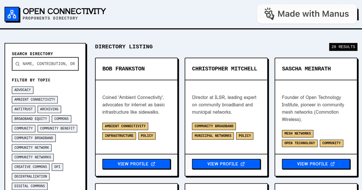 A searchable directory of leading advocates for open connectivity, ambient infrastructure, and digital equity