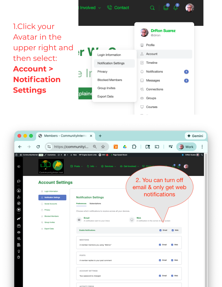 Don’t unsubscribe. If you do not want to receive emails from our website, then you can simply get your notifications here on the web, and you can even select the types of notifications you wish to receive. Notice the bell icon in the upper right corner, whose number shows how many notifications you have not read. The envelope icon to the left of the bell icon shows you the number of messages you have received.